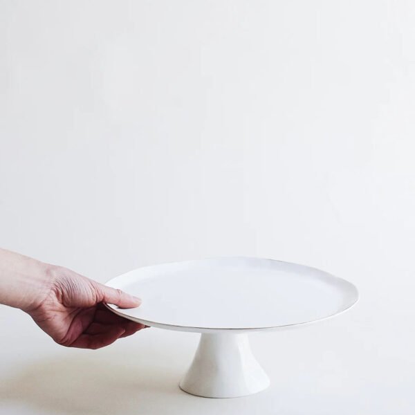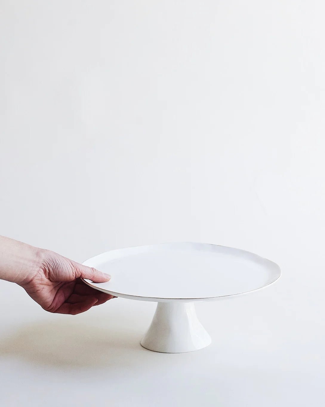The Cake Stand is placed on a pedestal to elevate your cake. pavlova or scone tower a top it. With a dimpled profile and large shallow lipped top lined with a sketch-like hand painted banding to contrast with the bright white of the fine bone china.