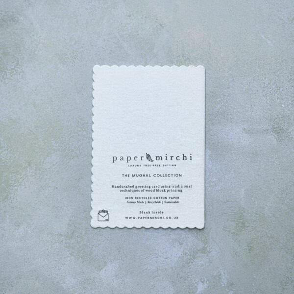 THE MUGHAL COLLECTIONFlowers have always had a prominent place in South Asian Art. particularly during the Mughal empire. Indian. Persian and Islamic influences characterise the unique style of Mughal art. Stylised floral motifs with intricate detailing and delicate linework are the distinctive features of these miniature paintings.Our Mughal Collection of greeting cards is strongly inspired by the artistic legacy of Mughal artwork. The designs are expertly hand block printed by skilled craftsmen on 100% cotton scalloped edge cards. Every card is a small piece of art and can be framed to create lasting memories.Size A6 (14.8 x 10.5cm). 100% recycled cotton paper.